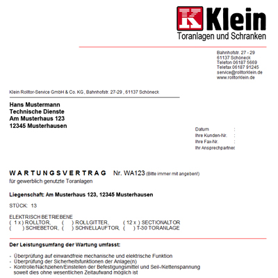 Wir dokumentieren alle Daten Ihrer Toranlage, Schranke. Sie bekommen von uns detaillierte Reparatur- und Wartungsprotokolle. Auf Wunsch erstellen wir Ihnen ein ausführliches Angebot mit verständlichem Aufbau und Einzelpreisen.